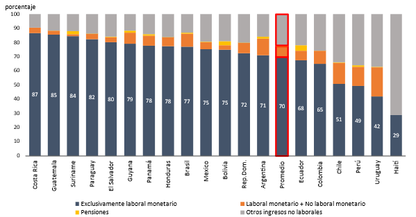En el siguiente gráfico, se observan los porcentajes de la población económicamente activa y su dependencia exclusiva de un tipo de ingreso en particular. Es evidente cómo en 16 de los 19 países analizados, la mayor parte de la población depende únicamente de su salario como fuente de ingreso.