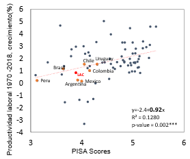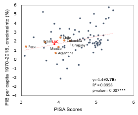 Al analizar la relación entre las habilidades de la población, -medidas por los resultados en pruebas estandarizadas como PISA-, e indicadores macroeconómicos como el PIB per cápita y la productividad laboral, es evidente que países con poblaciones con mayores niveles de habilidades tienen mayores niveles de crecimiento del producto interno bruto per cápita, además de mayor crecimiento en la productividad laboral.