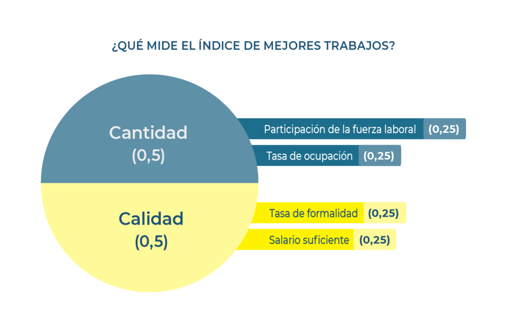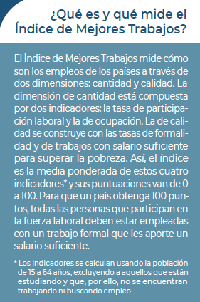 El Índice de Mejores Trabajos del Banco Interamericano de Desarrollo, que mide la calidad y cantidad del empleo en América Latina, coloca a la calidad del empleo en la región en 41,2 en una escala del 0 al 100 en su última medición. Esta medida, la última disponible de este Índice, indica que la mayoría de los trabajadores en la región se gana la vida desde la informalidad, y sus ingresos no son suficientes para superar el umbral de la pobreza. La cantidad del empleo tiene un desempeño diferente.Prácticamente estancada desde 2010, mantiene una calificación relativamente “alta” en una escala de 0 a 100: 74,1. En la región la cantidad de empleo excede a la calidad de manera significativa.
