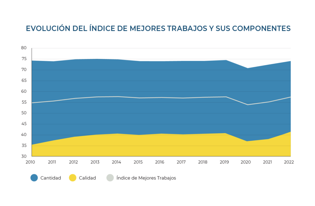 La calidad del empleo en la región tiene que aumentar rápido. Entre 2010 y 2022, la calidad del empleo en nuestro Índice de Mejores Trabajos creció a una tasa de 1,2% anual. A ese ritmo, tardaría más de 48 años en alcanzar el nivel de 74,1 puntos que tiene el componente de cantidad para 2022. No podemos esperar 50 años para crecer a niveles razonables de calidad.