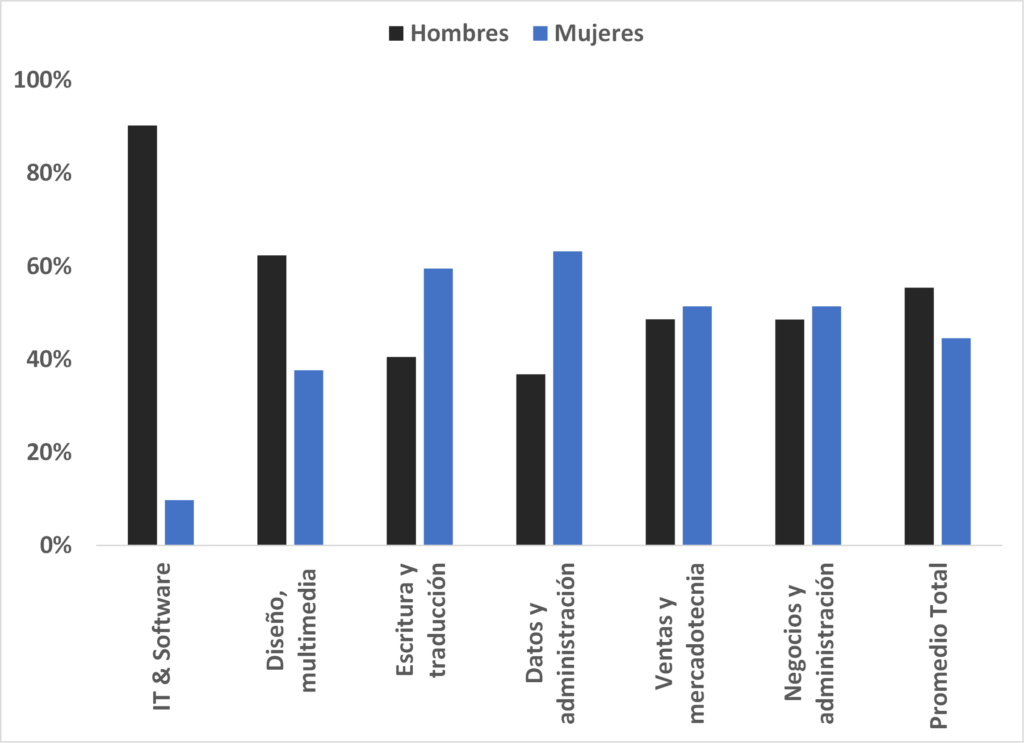 El 45% de los usuarios de Workana que participaron en la encuesta eran mujeres, lo cual sugiere cierto balance de género. Sin embargo, esta proporción varía de acuerdo con las diversas actividades que se pueden realizar en esa plataforma. Por ejemplo, en tareas relacionadas con tecnologías de la información, la proporción de mujeres cae a solo un 10%, mientras que, en tareas relacionadas con redacción y traducción, se eleva a 59%.