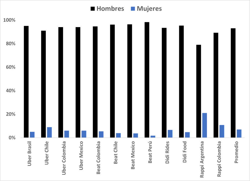 El sesgo por género a nivel industria es mucho más marcado en las plataformas de transporte y entregas. Las plataformas de movilidad y reparto en América Latina son las que más visibilidad tienen en el marco de la economía colaborativa o economía gig, y son las que más población utiliza como alternativa ocupacional. El BID ha logrado recolectar información de la mayoría de las plataformas de transporte en la región, trabajando en alianza con ellas y levantando encuestas en distintos países. Nuestras encuestas a usuarios conductores y repartidores de plataformas de movilidad en la región también dan cuenta de un sesgo muy marcado por género. La gran mayoría de los conductores y repartidores que laboran en estas plataformas son hombres, y las mujeres representan menos del 10% del total.