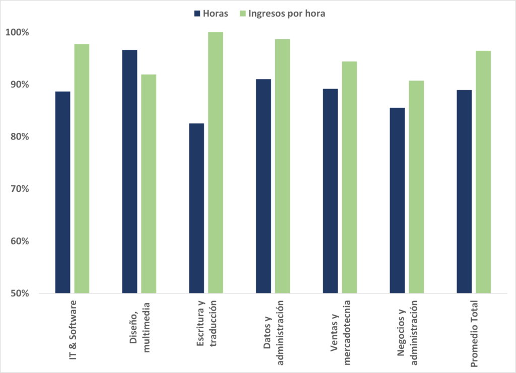Gráfica 3. Porcentaje de horas trabajadas e ingresos demandados por mujeres relativo a hombres en Workana*
