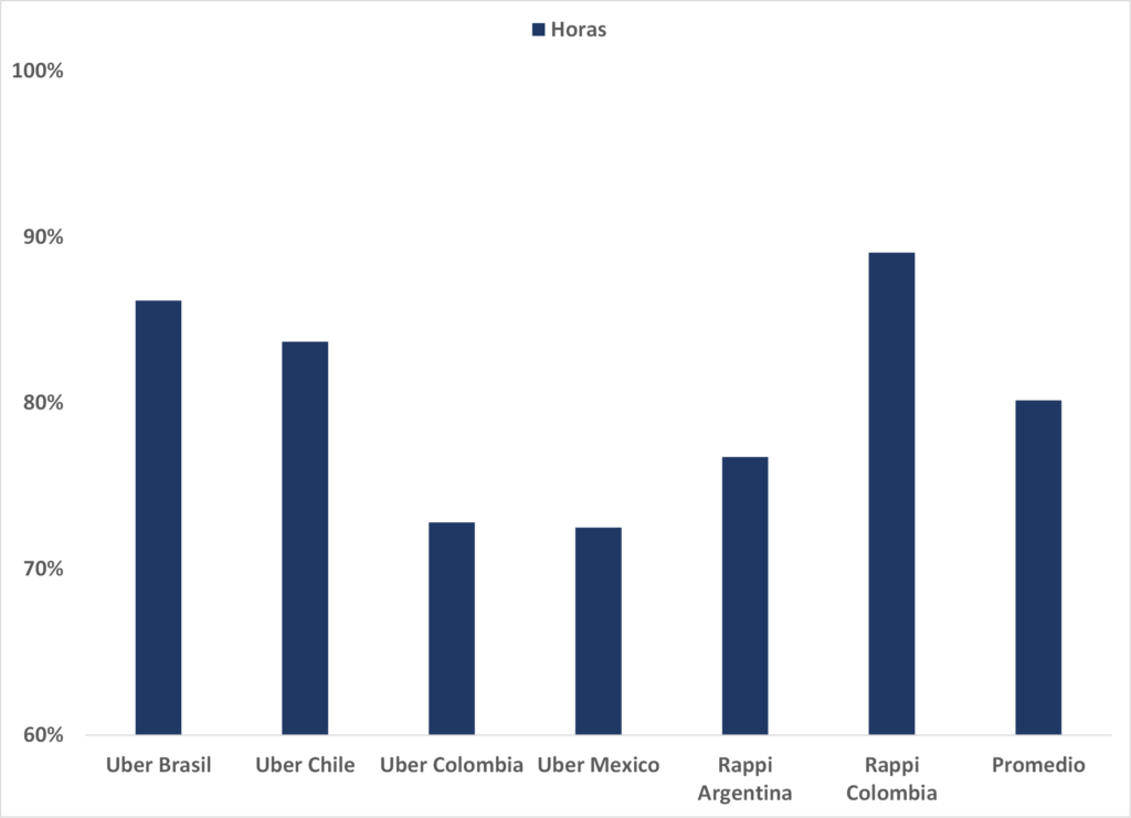 En la data recabada a partir de nuestras encuestas, no hay información sobre números de horas diferenciadas por género para todas las plataformas de transporte y entrega. En varios casos no se obtuvieron datos puntuales, sino por rangos. Estos datos muestran que en este sector las mujeres alcanzan a trabajar, en promedio, 80% del tiempo que alcanzan a trabajar los hombres en este sector de la economía colaborativa.