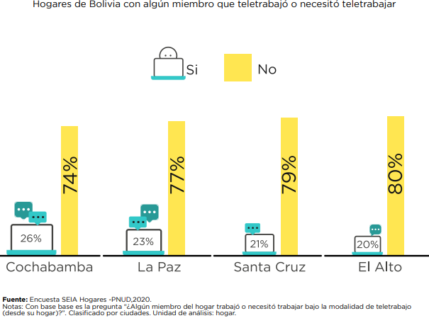 En Bolivia, durante el 2020, el Programa de Naciones Unidas para el Desarrollo (PNUD) levantó una encuesta en las ciudades capitales y la ciudad de El Alto. En base a estos datos se desarrolló el estudio conjunto BID - PNUD Teletrabajo en Bolivia: la digitalización en pandemia y su impacto en el modo de trabajar de los bolivianos.