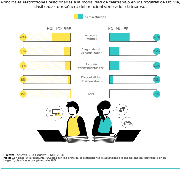Los trabajadores vieron interrumpida su rutina de trabajo presencial de manera abrupta, y las responsabilidades del trabajo y la familia se juntaron en el mismo espacio durante las medidas de aislamiento, generando, además, sobre todo en las mujeres, una doble jornada. Este problema es preexistente en el mercado laboral boliviano y este resultado respecto al teletrabajo es solo una manifestación del mismo.