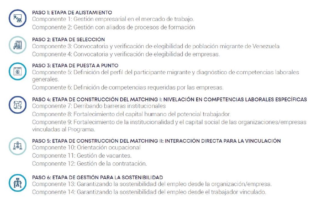 El segundo paso es la convocatoria de trabajadores y empresas. En el caso de los trabajadores en esta instancia se verifica que cumplan los criterios de elegibilidad y entre las empresas se corroboran las vacantes disponibles y la disponibilidad para participar en un proceso de formación y acompañamiento de contratación a población migrante de Venezuela.