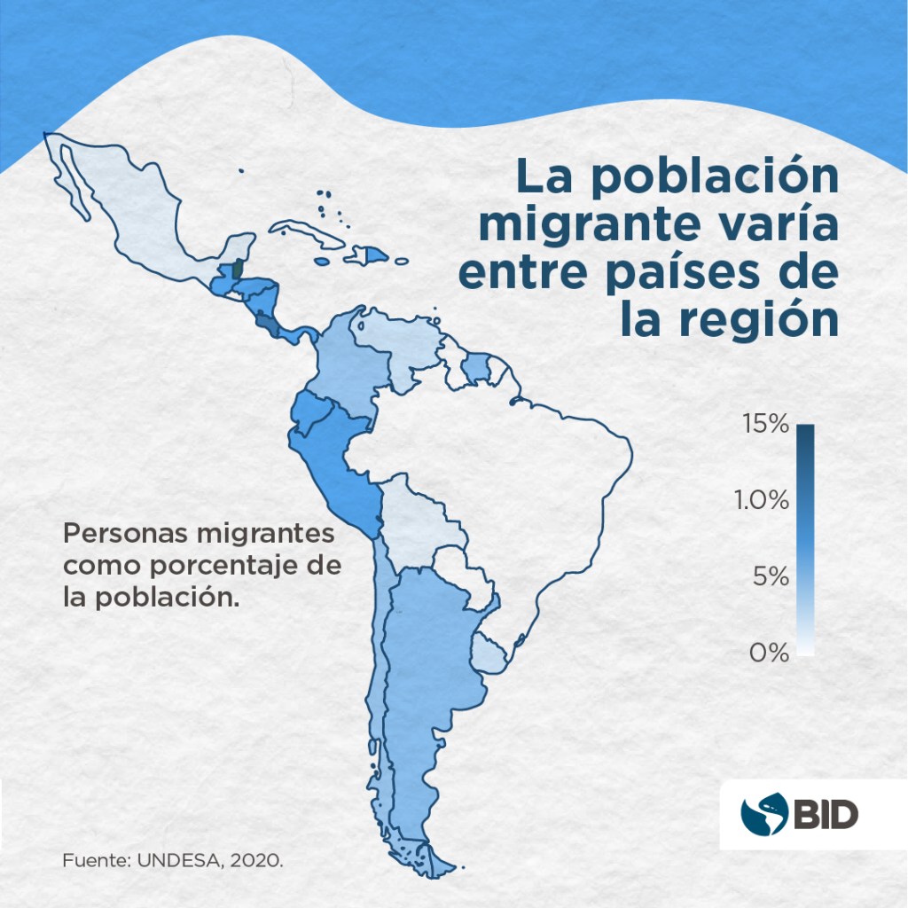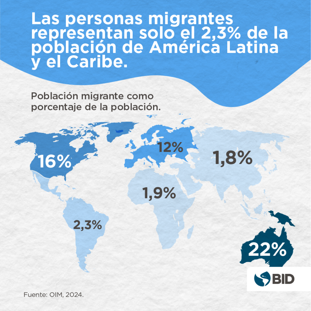 Aunque América Latina y el Caribe albergan a millones de migrantes, la región tiene una de las tasas más bajas de migración a nivel mundial. La población migrante representa solo el 2,3% de la población total de la región, en comparación con el 22% en Oceanía, el 16% en América del Norte y el 12% en Europa.