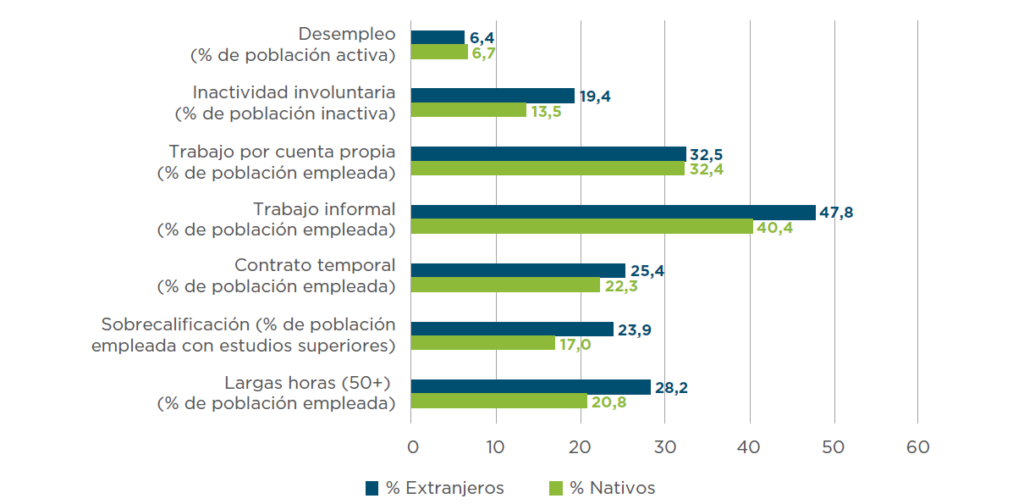 Fuente: Cálculos realizados por los autores basados en encuestas nacionales de los siguientes países: Argentina (EPH, 2021), Chile (ENE, 2020), Colombia (GEIH, 2021), Costa Rica (ECE, 2021), Ecuador (ENEMDU, 2022), República Dominicana (ENCFT, 2021), México (ENOE, 2020), Panamá (EHPM, 2019), Paraguay (EPHC, 2020), Perú (ENAHO, 2021) y Uruguay (ECH, 2019). Los números mostrados son promedios simples de los porcentajes nacionales.Sin embargo, sus capacidades se están desaprovechando. Por ejemplo, en promedio, una mayor fracción de la población migrante está involuntariamente fuera de la fuerza laboral que la población nativa. Además, una mayor fracción de la población migrante trabaja en empleos para los que están sobrecalificados.