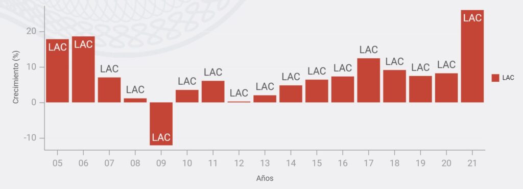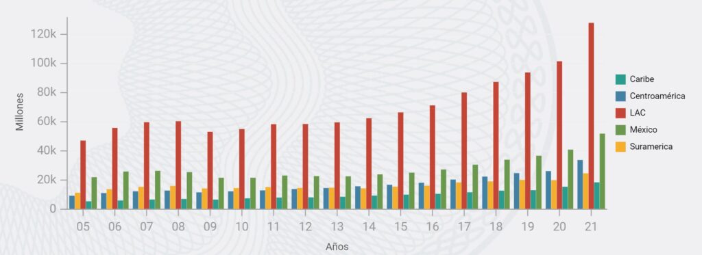 Durante el 2021 América Latina y el Caribe recibió 127.6 mil millones de dólares por remesas, lo que constituye un crecimiento anual del 26.0%, el más alto registrado en los últimos 20 años. El volumen de remesas a la región en 2021 fue casi el triple del nivel en 2005, con el aumento más grande en la historia.
