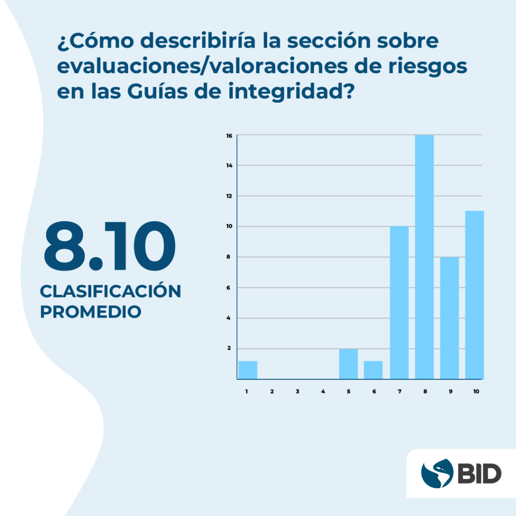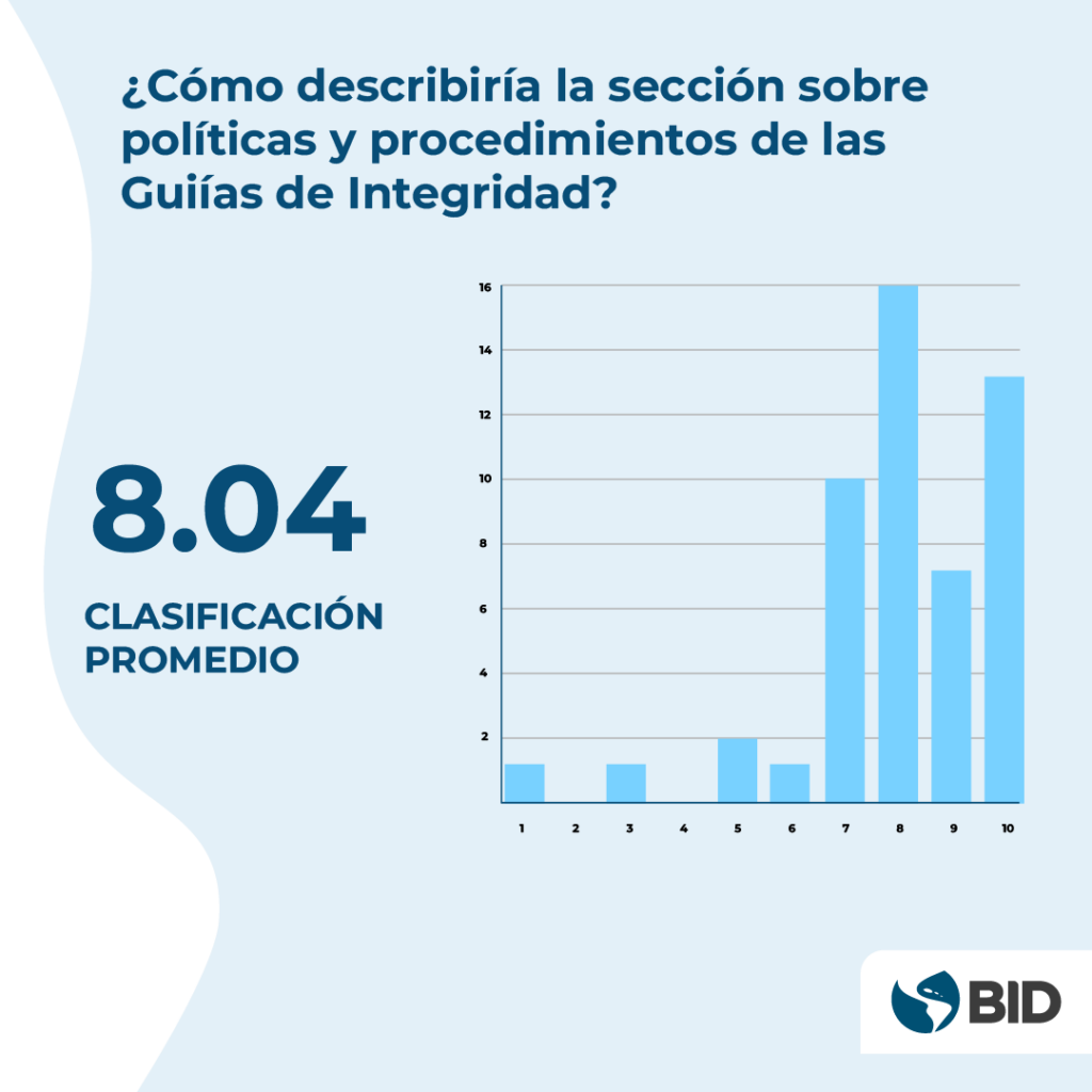 En enero de 2024, una encuesta realizada a 54 bancos en Panamá, de los cuales 51 respondieron, evidenció un alto nivel de interés y compromiso con las Guías. El promedio de evaluación que los bancos otorgaron a las Guías de Integridad, en una escala del 1 al 10, fue de 8.14, lo que refleja una aceptación muy positiva.