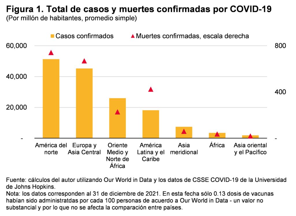 La pandemia ha afectado desproporcionalmente a los países de la región. El 31 de diciembre de 2020, los países de la región habían reportado más de 15.6 millones de casos confirmados y 500,000 muertes por COVID-19. Aunque el nivel de casos y muertes confirmados por millón de habitantes no es el más alto del mundo, pero el número de muertes en relación con el de casos sí lo es (figura 1).