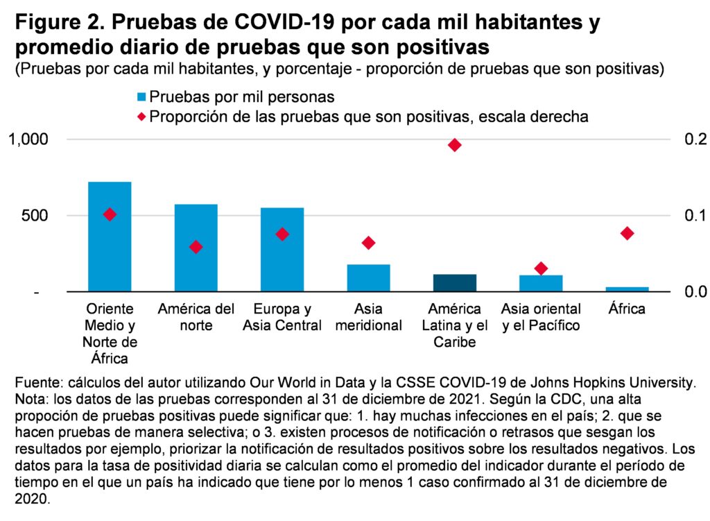 Los datos existentes muestran que la estrategia de pruebas en ALC ha sido inadecuada. A la fecha, la región ha implementado en promedio uno de los niveles más bajos de pruebas del mundo (figura 2). Algunos factores que afectan negativamente a las pruebas en la región son: