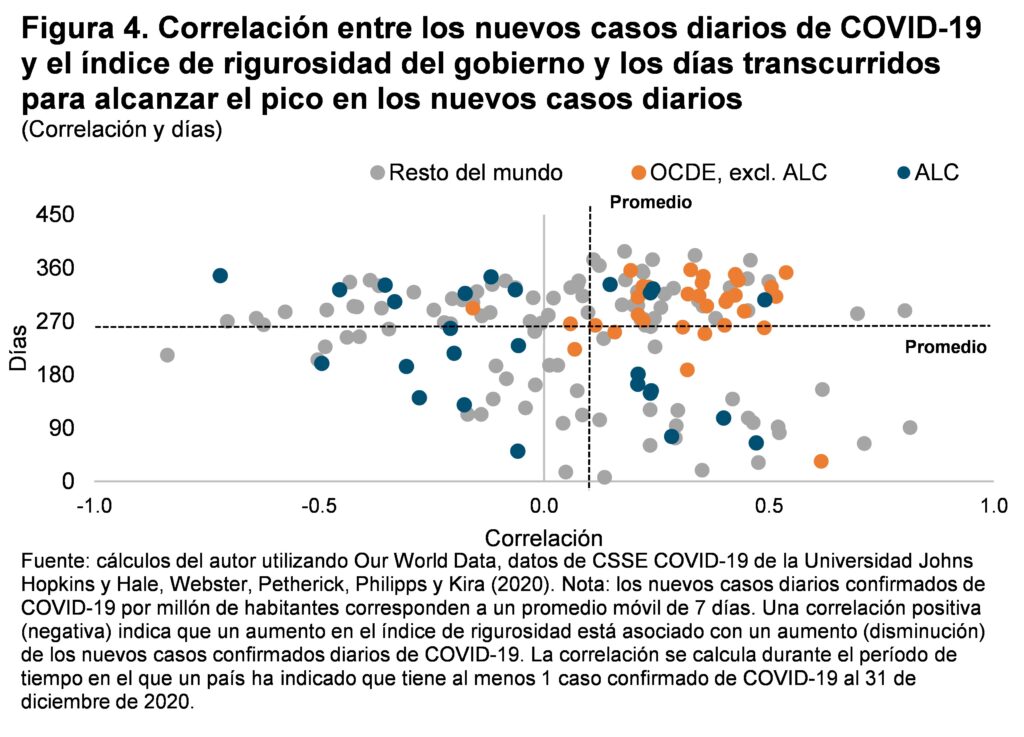 Para la mitad de los países de la región, las medidas más estrictas están asociadas con tiempos más largos para alcanzar el pico de infecciones diarias. No obstante, es importante enfatizar el uso de enfoques adaptativos en lugar de restricciones estrictas, ya que, presumiblemente, el cumplimiento de las restricciones disminuirá con el tiempo debido a los mayores niveles de informalidad y desconfianza hacia las instituciones públicas en ALC.