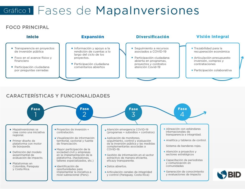 La plataforma MapaInversiones se ha caracterizado por su crecimiento gradual, articulando tres avances tecnológicos de utilidad para la agenda de transparencia e integridad en los países, a saber: