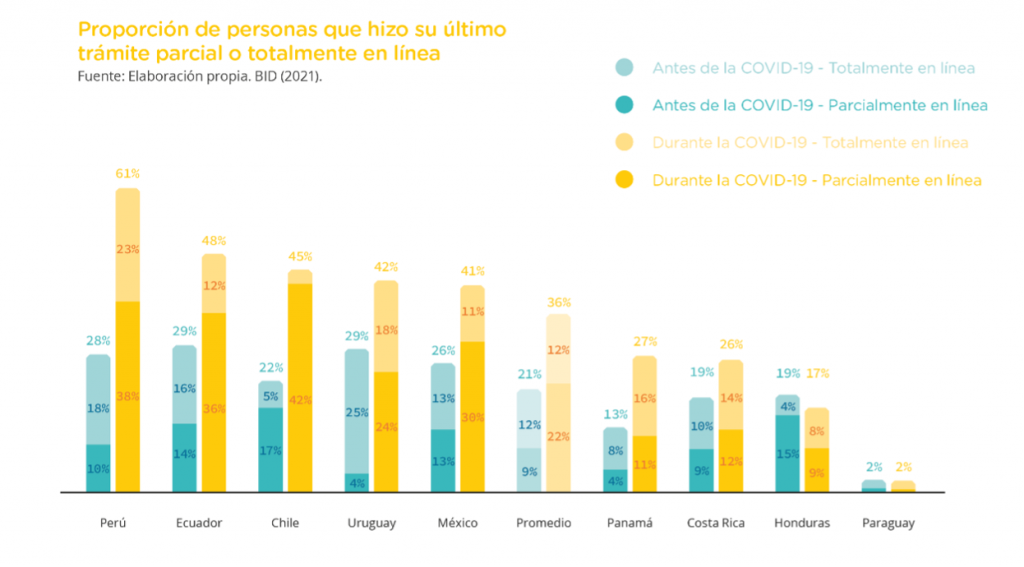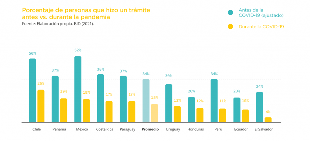 Afortunadamente, en varios países de la región los ciudadanos pudieron acceder a sus trámites de forma virtual. Los avances en el ecosistema de gobierno digital les permitieron a los gobiernos digitalizar trámites rápidamente durante la pandemia, aumentando la disponibilidad de servicios digitales. La proporción de personas que usó el canal digital para hacer un trámite aumentó de 21% antes de la pandemia a 36% durante la misma.