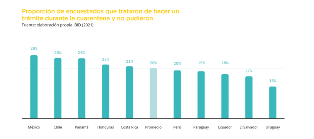 Aunque las reducciones en la cantidad de trámites pueden deberse en parte a una menor necesidad, para muchas personas este no fue el caso: no haber hecho un trámite fue consecuencia de la falta de disponibilidad. De hecho, el 20% de los ciudadanos encuestados dijo no haber podido acceder a un servicio que necesitó durante la pandemia. La razón principal detrás de este menor acceso a servicios público parece ser el cierre de algunas oficinas públicas y la falta de disponibilidad de ciertos trámites en línea.