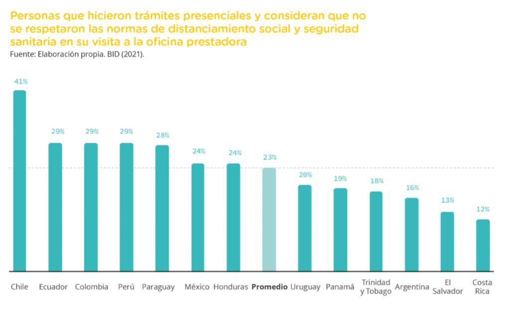 A pesar del gran aumento general de los trámites en línea, el 50% de los ciudadanos de la región hizo un trámite en persona durante la pandemia. Aunque las entidades realizaron grandes esfuerzos para garantizar las condiciones de salubridad requeridas, algunas personas manifestaron no haberse sentido seguras cuando acudieron a las oficinas públicas. En promedio, el 23% de los ciudadanos que hicieron un trámite en persona opinaron que no se habían respetado las medidas de distanciamiento social y bioseguridad en la oficina.