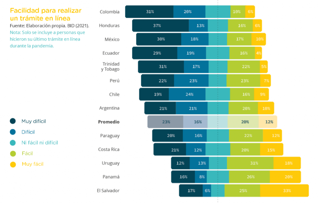 Muchos ciudadanos tuvieron dificultades haciendo sus trámites en línea durante la pandemia. En promedio, el 39% de las personas reportó que su experiencia haciendo trámites por este canal había sido muy difícil o difícil. Las razones de esta dificultad son variadas: el 18% experimentó problemas técnicos con la página, el 14% pensó que la información para hacer el trámite no era clara y el 8% contestó que el trámite no podía hacerse desde un dispositivo celular.