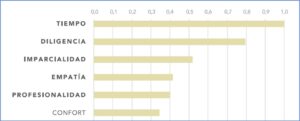 Se observa que los ciudadanos consideran que el tiempo es oro y que dan mucha importancia al desempeño de los funcionarios que les atienden: los quieren eficientes, que traten a todos por igual, que tengan empatía y que estén técnicamente preparados. Interesa notar que la digitalización de trámites contribuye a mejorar todos estos aspectos: permite reducir tiempos y reduce la necesidad de interacciones presenciales. Ahora bien, ¿cuáles son los niveles de adopción del canal en línea? Solo el 5% de los encuestados indicó haber realizado su trámite digitalmente cuando, al mismo tiempo, 45% hubiera preferido utilizar ese canal de atención. Esto muestra una enorme demanda insatisfecha para los usuarios digitales. Es cierto que alguno de los trámites es necesariamente presencial (por ejemplo, la renovación del documento de identidad). Sin embargo, para los restantes, son posibles alternativas basadas en simplificación y digitalización, algo que se ha puesto muy de manifiesto en el contexto actual del COVID-19.La gestión de la calidad: la gran ausente en las evaluaciones de la administración pública