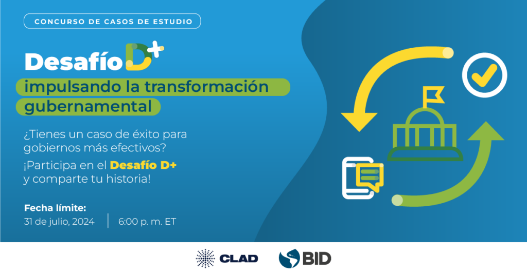 Si tienes un caso de estudio para compartir, participa en el Desafío D+ Impulsando la Tranformación Digital, una iniciativa conjunta del BID y CLAD.