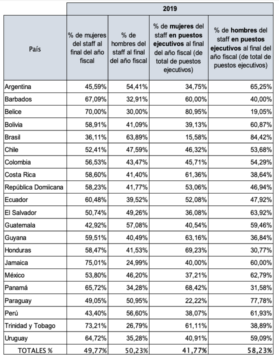 Dentro de los datos analizados, sobresalen diferencias muy ponderadas entre países de ALC como muestra la Tabla 1. Mientras que, en algunos países como Belice, Panamá, Honduras, Guyana, Costa Rica, Trinidad y Tobago y Barbados, las mujeres en las ATs ocupaban más del 60% en puestos ejecutivos del staff, en otros países como Brasil, Paraguay, Argentina, El Salvador, México, Perú o Bolivia, la ocupación de mujeres en estos mismos cargos era baja, en algunos casos, menos del 25%.