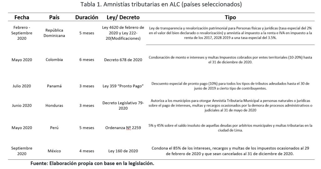 Las amnistías son oportunidades excepcionales y transitorias para regularizar bienes no declarados, así como obligaciones tributarias relativas a uno o más periodos fiscales anteriores. Esto, a cambio de una condonación en el monto original o en los intereses y sanciones. Habitualmente incluyen la renuncia a las sanciones penales y civiles. De manera general, se pueden hacer por tipo de impuesto y contribuyente o pueden ser de carácter general. La tabla 1 presenta un resumen de las iniciativas recientes lanzadas en la región en el marco de la emergencia del Covid19.
