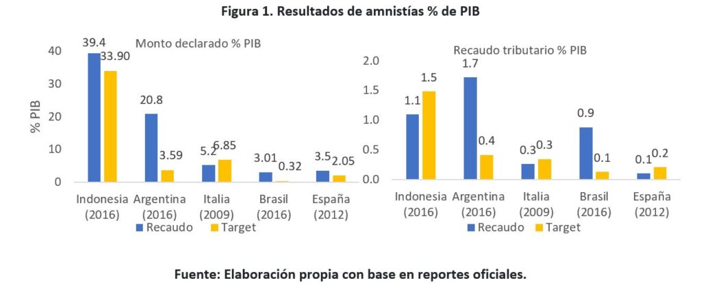 La figura 1 muestra los resultados de estas amnistías, que en esencia fueron concebidas como regímenes excepcionales para regularizar capitales omitidos o inadecuadamente declarados, por un periodo de duración promedio de 6 meses, a través del pago transitorio de tasas entre (0 al 15% del impuesto a la renta y las propiedades), reducción de intereses y penalidades y oportunidades favorables para valorización de activos.