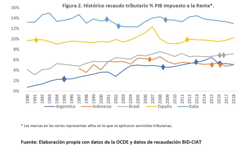 En algunos casos, los gobiernos han encontrado difícil el restringirse a una sola amnistía, como lo sugieren las recientes experiencias que son consideradas como unas de las “más exitosas” en términos de recaudo tributario y valores declarados brutos. Este es el caso de Argentina (2016), Indonesia (2016), Italia (2009), Brasil (2016) y España (2012).