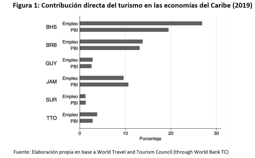 Debido al colapso global de la demanda, la región del Caribe enfrenta una disminución significativa en las exportaciones de bienes y servicios, así como en las remesas. Esto es particularmente preocupante para los países del CCB dada su estructura económica. En Bahamas, Barbados y Jamaica, la participación del turismo en el PIB es de entre el 10 y 20 por ciento, mucho más alta que la del mundo y las medianas de América Latina y el Caribe (ALC), y su contribución directa al empleo es aún más significativa (ver Figura 1). Además, el colapso de los precios de las commodities, especialmente el shock del petróleo ha disminuido significativamente los términos de intercambio y los ingresos fiscales de las economías de las economías impulsadas por las commodities como en Guyana, Surinam y Trinidad y Tobago.
