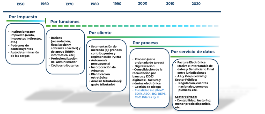 Esta enorme acumulación de información sobre los contribuyentes está convergiendo las administraciones en centros de datos e inteligencia económica, expandiendo las líneas de negocio desarrolladas a lo largo de décadas y, por ende, generando cambios en los arreglos institucionales para cumplir con estas funciones (Figura 1).