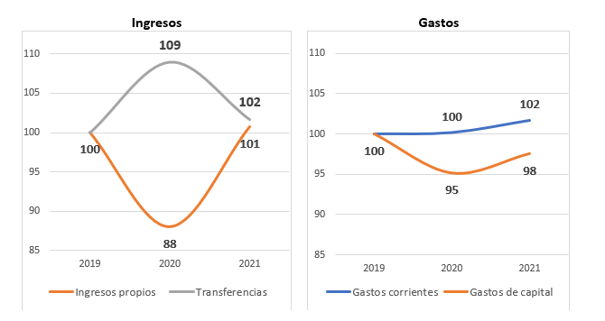 El gráfico 1 muestra, por el lado de los ingresos, que durante 2020 aumentó la dependencia de transferencias, debido a menores ingresos propios y un crecimiento de las transferencias extraordinarias para atender la emergencia, tendencia que se revirtió en 2021.