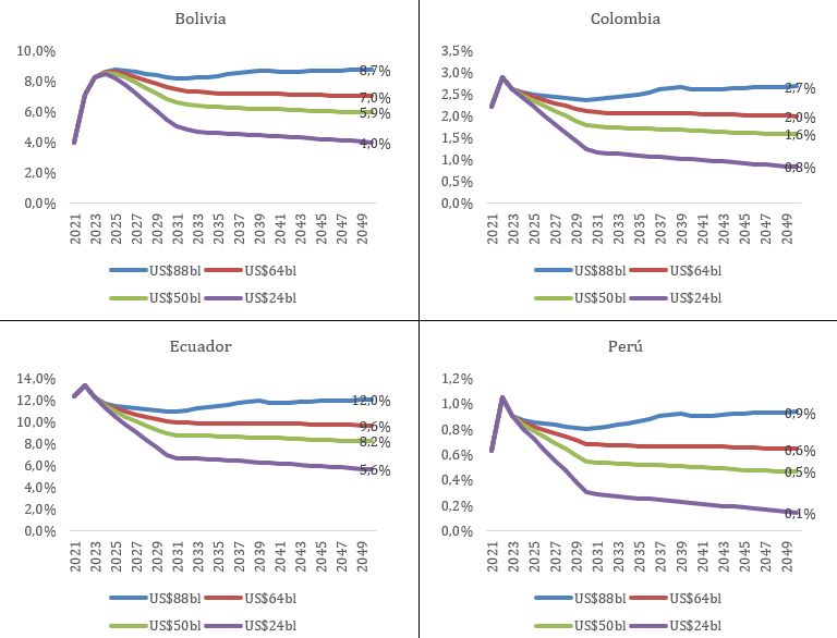 Para los gobiernos de la región, estas tendencias implicarán una reducción y mayor volatilidad de sus ingresos fiscales. Para poder dimensionar las implicancias de estas tendencias sobre los resultados fiscales de los gobiernos realizamos diferentes estimaciones basadas en varios niveles de precios del petróleo, los cuales se reflejan en la Figura 1.