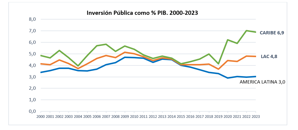 La inversión pública tiene el potencial de ser un motor fundamental para el crecimiento económico, impulsando la demanda, incrementando el stock de capital, reduciendo las brechas de acceso a servicios básicos y, en última instancia, mejorando el bienestar de las personas. Sin embargo, durante la última década, el gasto en inversión pública en América Latina ha experimentado una caída de más de 30% en promedio (de 4.5% a 3% del PIB entre 2013 y 2023).