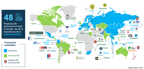Hasta ahora, existen 48 taxonomías de finanzas sostenibles a nivel mundial (UNEP-FI, 2024). Algunos países como Canadá, Reino Unido, países de la Unión Europea y China, ya cuentan con experiencias en la implementación de taxonomías.