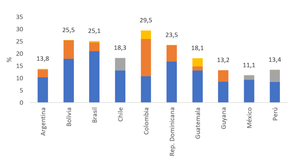 El potencial ingreso que representa la industria minera es significativo y, en este sentido, puede contribuir a dicha financiación. Aquellos con vocación minera reflejan una mayor participación de estas rentas como porcentaje del PIB. En ALC se destacan Chile (7.5% del PIB), Guyana (6.4%), Surinam (6.2%) y Perú (5.6%). Estos ingresos son superiores a los obtenidos en otros países del mundo (en promedio, 3.9% del PIB) y de la región, como Argentina, Bolivia, Brasil y Colombia, entre otros, cuyos ingresos son inferiores al 2% del PIB. En los próximos años se espera un repunte de estos ingresos, en particular de aquellos relacionados con minerales que atienden los requerimientos de la transformación energética y el desarrollo de nuevas tecnologías de comunicación.