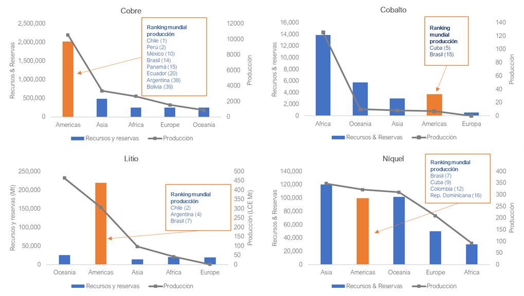 Figura 1. Posicionamiento de América Latina en la producción de algunos minerales críticos en 2022 y los recursos mineros disponibles