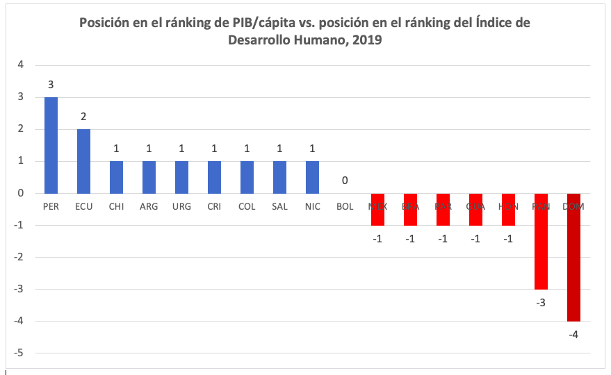 Por ejemplo, de acuerdo con las estimaciones del Informe de Desarrollo Humano 2020 del Programa de las Naciones Unidades para el Desarrollo (PNUD), República Dominicana es el país de América Latina cuya posición en el ranking de desarrollo humano se encuentra más por debajo de lo que cabría esperar por su PIB per cápita. En contraste, Costa Rica, un país con ingreso per cápita similar, se encuentra seis posiciones por adelante de República Dominicana en términos del índice de Desarrollo Humano.