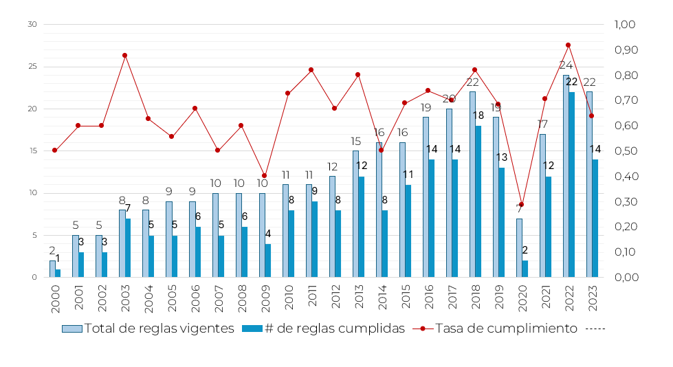 Fuente: Ulloa-Suárez y Valencia, 2024. Nota: las barras de color azul claro representan el total de reglas fiscales vigentes, considerando que un país podría haber implementado más de una regla en un año determinado. Las barras de color azul oscuro representan cuántas de las reglas implementadas fueron cumplidas. La trayectoria roja representa la tasa de cumplimiento medida como el número total de reglas cumplidas dividido por el número total de reglas implementadas. La línea horizontal punteada representa la tasa de cumplimiento promedio ponderada durante 2000-2023.