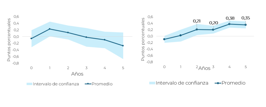 Como se muestra en la Figura 1, Panel B, los beneficios del cumplimiento se vuelven aún más significativos con el tiempo: dos años después del cumplimiento, la inversión pública tiende a aumentar hasta en aproximadamente 0,3 puntos porcentuales del PIB. Esto sugiere que, aunque las reglas fiscales no dictan los niveles de inversión, el cumplimiento crea el espacio fiscal necesario para mantener o expandir la inversión pública.