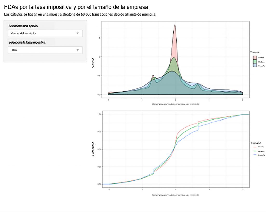 La Figura 1 permite ver las funciones de distribución acumuladas (FDAs) de diferentes estadísticos de las firmas, como las ventas, determinando el nivel de la tasa impositiva y el tamaño de la firma. La FDA muestra la probabilidad de que una observación aleatoria que se toma de las firmas sea menor o igual a cierto valor de interés (en este caso la tasa impositiva).