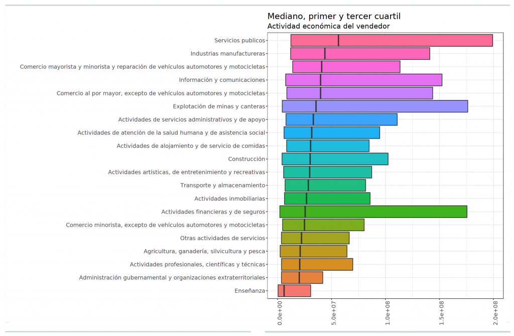 La Figura 3 muestra el volumen del IVA de las firmas en diferentes actividades económicas (se puede seleccionar también otros indicadores como los mencionados en el párrafo anterior). Las barras en la Figura 3 representan la distribución del impuesto sobre las ventas de las empresas dentro de un sector. Como se observa en la figura, las firmas pertenecientes a sectores como servicios públicos e industrias manufactureras pagan en promedio más impuestos sobre las ventas. Tener estos indicadores es importante para el rediseño de la política fiscal considerando la heterogeneidad por sectores económicos.