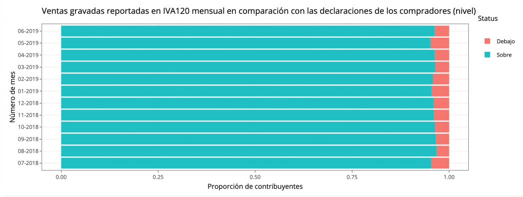 Toda esta información se observa de forma mensual. Para todos los casos hay más firmas que no subdeclaran (barras celestes son más largas que las barras rojas). Además, se puede observar en qué meses hay más subdeclaración, que en este caso sería el mes 5 (mayo) y el mes 4 (abril). Esta información es útil para guiar las políticas hacia las firmas con más riesgo de subdeclaración, y planear estrategias de fiscalización en los meses con mayor riesgo.