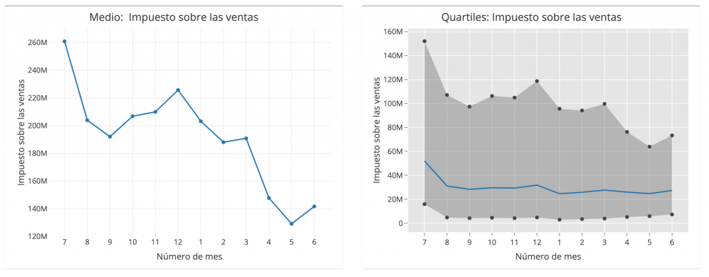 El tablero de impuestos muestra diferentes indicadores clave para mejorar el seguimiento, la focalización del cumplimiento y la definición de la política fiscal. Por ejemplo, el tablero muestra la evolución en el tiempo de muchos indicadores económicos (como el impuesto sobre las ventas) en promedio y por cuartiles (ver Figura 2).
