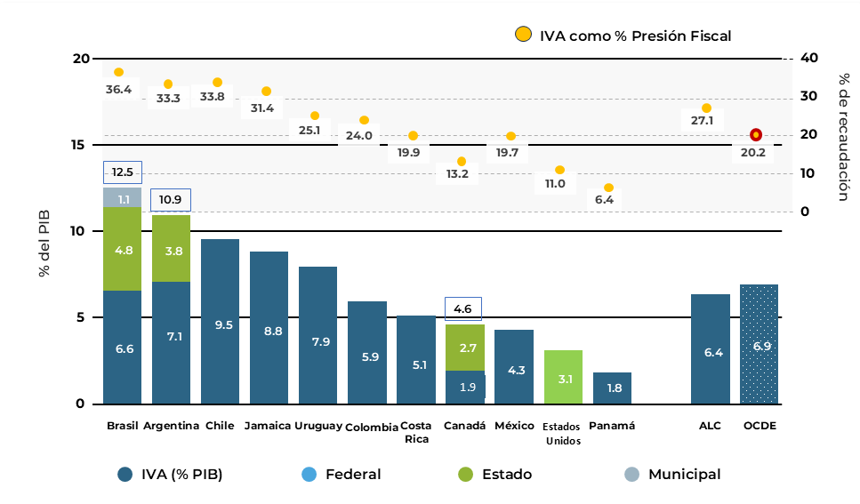 Nota: En EE.UU., el impuesto es estatal sobre las ventas; en Argentina, el impuesto estadual (Ingresos Brutos) tiene un efecto en cascada. Fuente: Presión Fiscal en las Estadísticas Tributarias de América Latina y el Caribe (OCDE, BID, CEPAL y CIAT, 2024). La reforma fiscal de Brasil sigue los mejores modelos internacionales de IVA