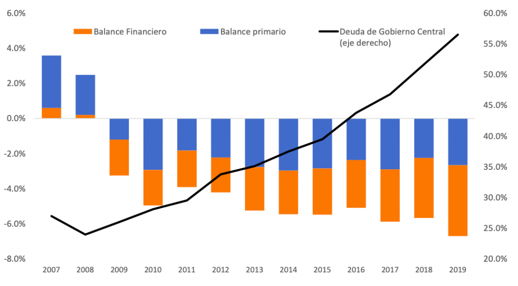A finales de 2018 el país aprobó una reforma fiscal integral contenida enla Ley de Fortalecimiento de las Finanzas Públicas, cuya implementación exitosa lograría disminuir el déficit del gobierno central, que llegó a promediar el 5% del PIB en la década pasada, y estabilizar la deuda en el mediano plazo, que había pasado de 24% en 2008 al 52% del PIB en 2018 (ver Gráfico 1).