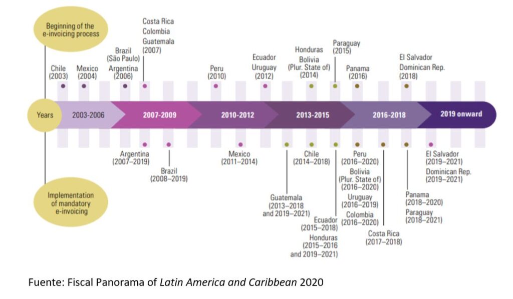 Línea de tiempo de implementación de la Factura Electrónica.Para continuar apoyando a los países a fortalecer su control tributario a través del uso de la factura electrónica, organizamos en agosto de 2020 un webinar con nuestra red de expertos, donde representantes de las administraciones tributarias de los principales países de la región compartieron sus soluciones. La evasión es aún un desafío grande en la región. Estudios muestran que los niveles promedio de incumplimiento del IVA para un grupo seleccionado de 12 países de América Latina y el Caribe se han mantenido en alrededor del 30%.