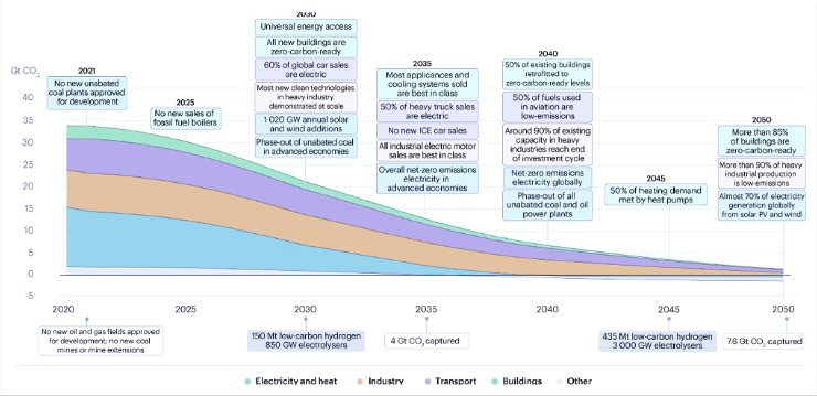 Las acciones y fechas límite necesarias para la transición a cero emisiones son diversas según el país y el sector, pero pueden incluir objetivos como: la eliminación de plantas termoeléctricas a base de carbón antes del 2035, incentivar la electromovilidad a nivel de oferta y demanda para alcanzar la total renovación de vehículos a modelos cero emisiones antes de 2040, etc.