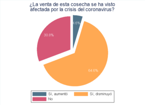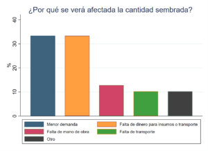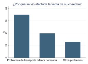 Los resultados del análisis muestran que ya se evidencian importantes problemas con la producción agropecuaria. Con respecto a la venta, el 65% de productores afirmaron que el Covid-19 afectó la venta de su producción agrícola, principalmente por la dificultad para transportar los productos a los mercados (reportado por un 70%) o por una diminución de la demanda (reportado por un 40%), entre otros factores. Además, un 67% encontró un precio menor al esperado para sus productos. Sin embargo, los problemas no terminan aquí. Otras decisiones productivas también se han visto afectadas. Más de la mitad (51.5%) de los productores encuestados mencionaron haber tenido problemas con la obtención de los insumos que necesitaban para la producción (p.ej. semilla, fertilizante, funguicida, herbicida, insecticida), mientras que un 40% reportó dificultades en conseguir mano de obra. Ambos problemas se vincularon muy frecuentemente con las restricciones de movilidad, las cuales también afectaron al transporte de los productos al mercado para un 70% de los encuestados.