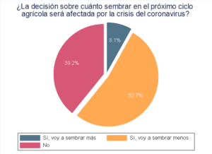 Estas interrupciones al flujo habitual del ciclo agrícola implican una reducción en los ingresos y la capacidad de gasto de los productores encuestados, limitando la continuidad de la producción y presentando ya un urgente problema de liquidez. De hecho, el 70% de los encuestados indicó haber tenido que vender activos, utilizar ahorros o solicitar préstamos para afrontar la crisis actual. Además, a pesar de varias políticas que los países de la región han implementado para apoyar al sector en respuesta a la crisis, sólo el 23% de los encuestados reporta haber recibido apoyo del gobierno relacionado al Covid-19. Mirando hacia el futuro, los productores esperan que la situación productiva se agrave en la siembra, cosecha y venta. Un 40% piensa que el coronavirus traerá problemas para la cosecha futura, mientras que un 53% planea sembrar una cantidad menor a la usual debido a la crisis. Un tercio de los productores asignó esta probable reducción en la siembra a una menor demanda observada, mientras que otro tercio identificó la falta de dinero para comprar nuevos insumos como la razón principal